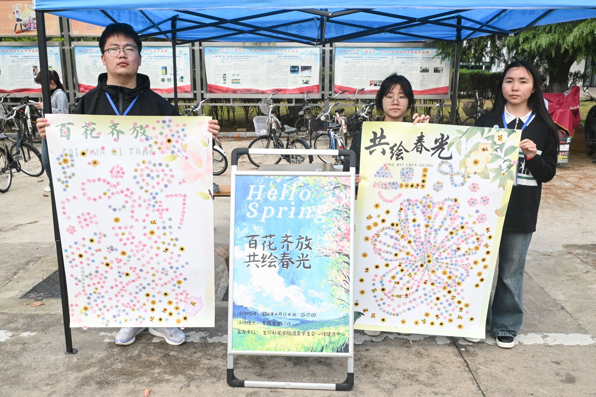 随着活动的进行,原本空白的展板版面渐渐变得五彩斑斓,形成了两幅独具 匠心的拼贴作品。通过拼贴画的形式,春花之美在展板上有了具体的呈现,两幅 锦绣缤纷的春日画卷被众多参与者拍照留念。