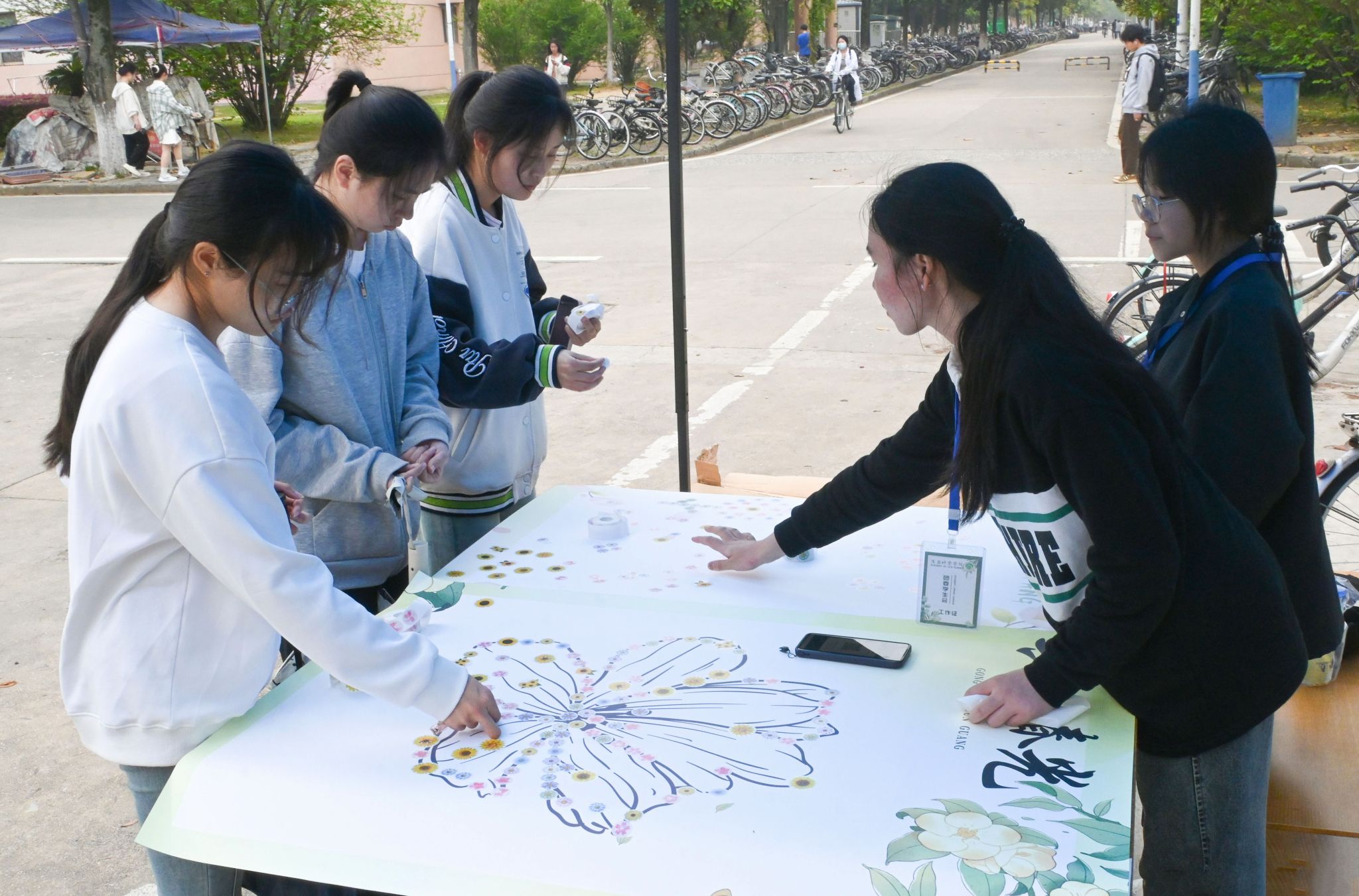 “我们用一朵朵小花拼成了一束大花,感觉十分有趣。”数学与应用数学专 业 2020级5班的芮瑞感叹。平时就擅长手工的她,和好友在“百花齐放 ”展板 前精心挑选贴纸,合作拼贴出一朵花的图案,“以花绘花 ”的创作吸引了许多学 生驻足观看。临走前,芮瑞用手机记录下了这一色彩纷繁的“花朵 ”。