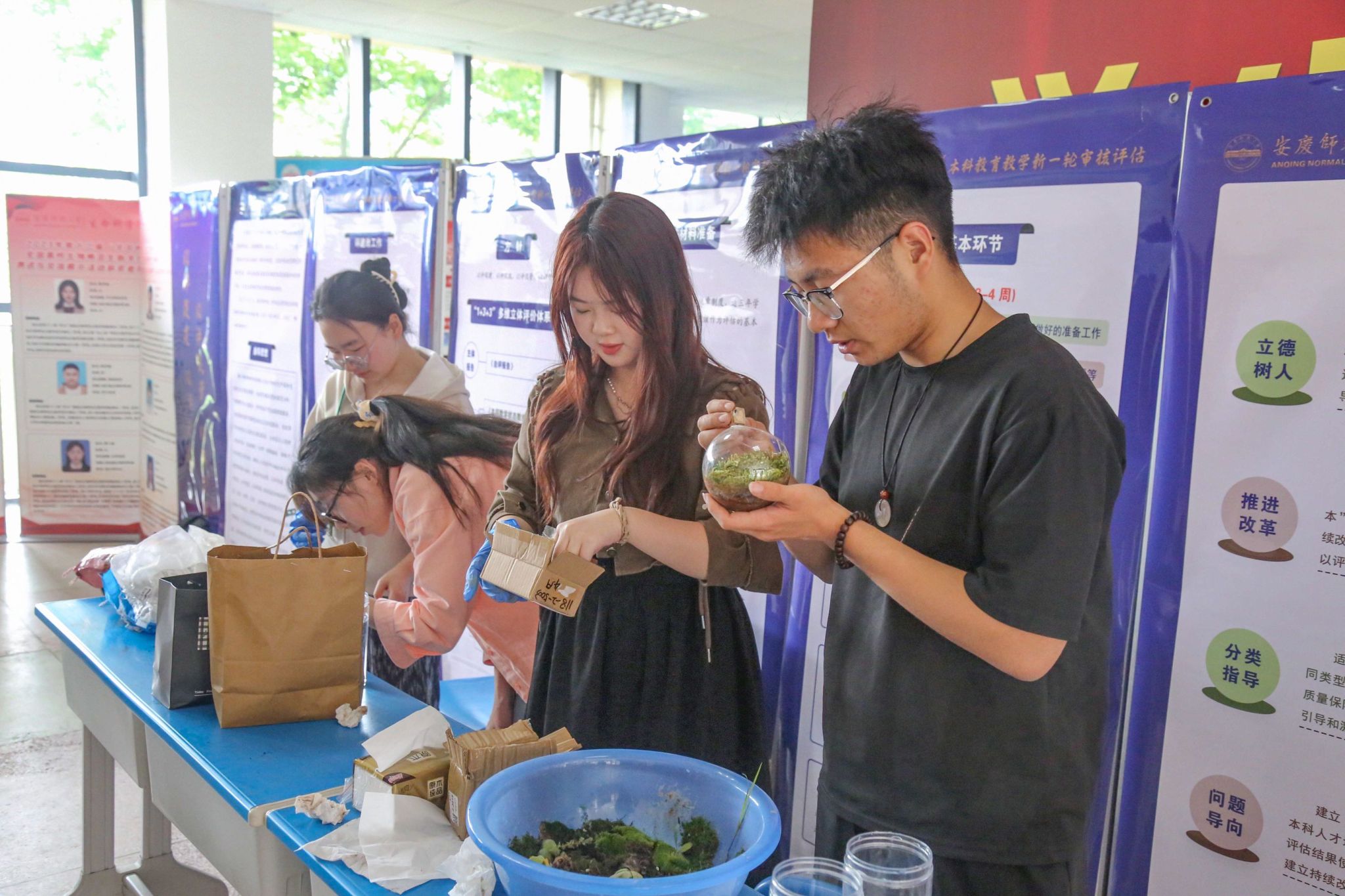 “制作的首要原则是符合生态学原理,使其成为一条完整的生物循环链,在此基础上大家就可以尽情发挥自己的创意了。”生态学专业2022级的汪洋一边分发材料,一边向员工介绍操作的注意事项。用椰泥铺实玻璃缸底部,插入不同种类的多肉植物,再铺上一些鹅卵石,旅游管理专业2023级1班的宋玉灿和她的室友们化身“设计师”,将生态缸打造为一个绿色温馨的小世界。“我们搜索了很多图片,最终一拍即合,打算选择以容易培养、生命力强的多肉植物作为主体。”她表示,通过搭建生态缸,使自己更加了解植物生存所需要的环境,希望大家在面对学习、生活上的困难时,也能像多肉一样不屈不挠,勇敢坚毅。