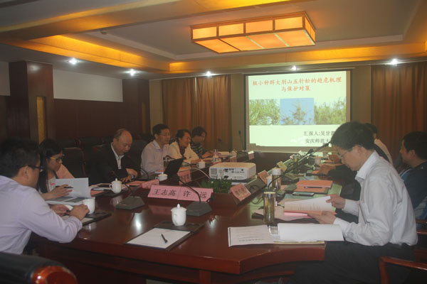 专家组冒雨查看了大别山五针松保护示范基地,对基地建设情况进行了详细的考查。汇报会上,项目主持人吴甘霖教授代表项目组对项目执行情况进行了介绍,汇报内容包括项目执行情况、经费使用情况、组织管理和机制创新经验、存在的问题与建议等五部分。