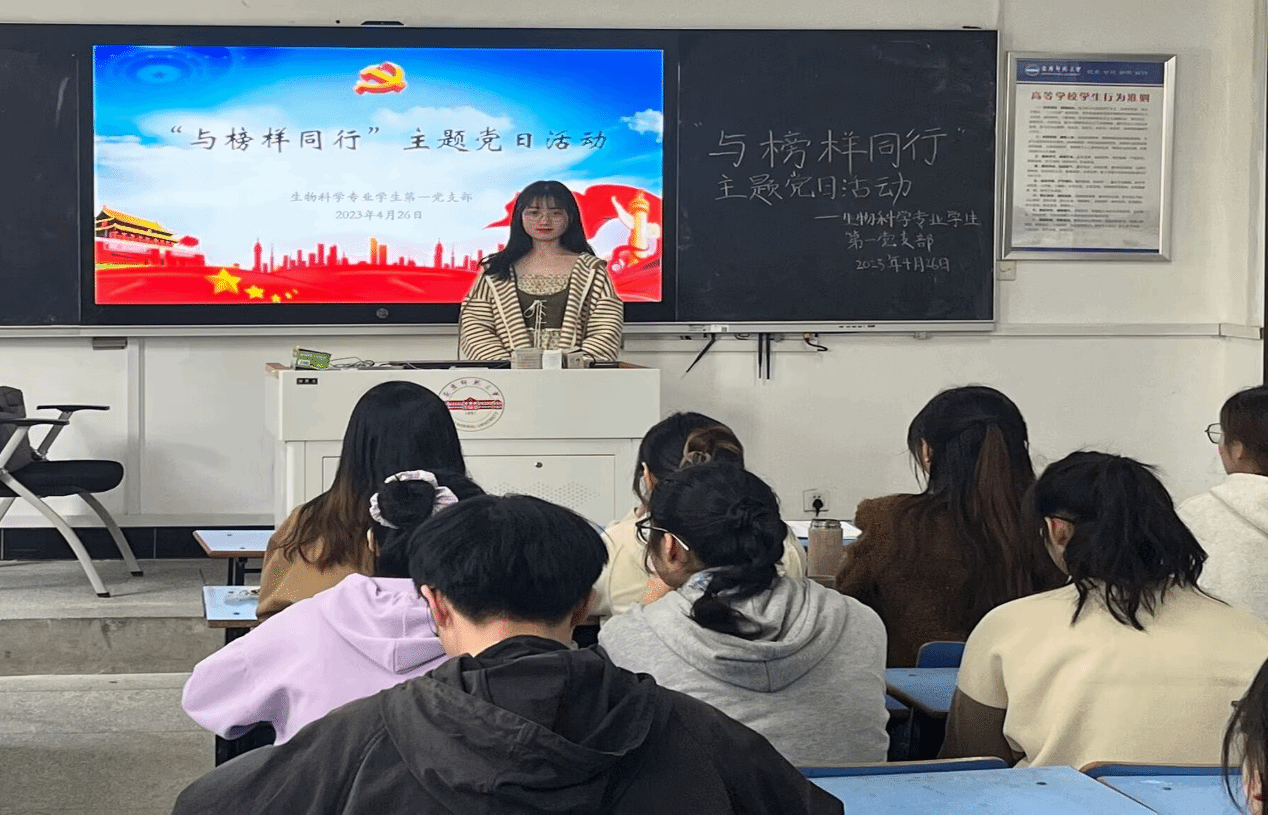观看结束后,党支部优秀员工代表2019级吴焕楠和陈旭阳作经验分享。吴焕楠同学向大家介绍了在大学期间生物科学专业同学可以参加的大型赛事,如:全国老员工英语竞赛、挑战杯、互联网+、师范生技能大赛等等,并分别介绍比赛的含金量及自己觉得适合参加的比赛,同时也分享了自己参加比赛的收获,让自己保持上进心,有所成长。陈旭阳同学分享她的考研经验,分别详细讲了她在备战期间如何进行英语、政治、生物化学、细胞生物学各科的学习,自己考研中使用的网课资源,考研资料、习题推荐,还有她在考研期间遇到的问题及自己踩过的“坑”,给予学弟学妹们很多中肯有用的建议。