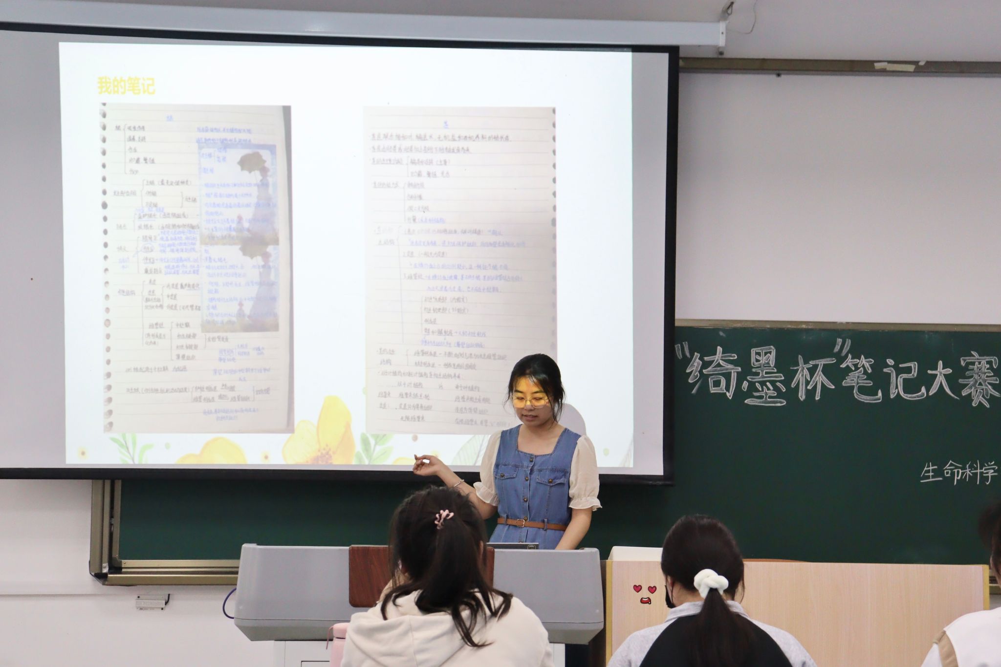 首先上台的是2023级生物科学类专业4班的李嘉慧同学,“我要向大家介绍的是all in one笔记方法”,她向我们展示将所有的笔记都记在一本活页本上,不仅方便携带而且容易翻阅,避免了上课时带很多笔记本且容易混淆的情况。“我觉得笔记不一定是要记在本子上的,也可以记在平板或电脑上,这便是我要介绍的电子笔记”,2023级生物科学类专业4班的鲁珍明同学表示电子笔记不仅可以帮助我们节省记笔记的时间,而且比手写笔记更加清晰明了。本次活动不仅有精彩的ppt演讲,同时也邀请了三位评委对其做出评价和打分,她们分别是2021级生物科学2班的张丽萍、2022级生物科学3班的陈希锐和秦佳佳评委,“从你的汇报中我们可以看出来你的笔记确实做的很认真,字迹工整也很齐全,演讲过程中的思维逻辑性也很强,唯一不足的一点就是缺少了和观众的互动……”,陈希锐评委点评道。