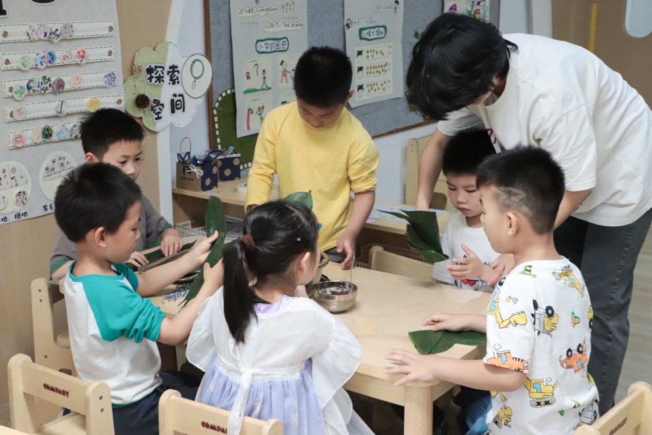 “我跟着家中的长辈学习了包粽子的方法,活动开始前,也在网上看了许多包粽子的视频。”为了给小朋友们教授正确的总粽子制作方法,食品科学与工程专业2023级徐玉湄做了很多准备。在包粽子环节中,徐玉湄一边讲解有关端午的知识,一边帮助小朋友们进行粽子的制作。小朋友们“有样学样”,对折粽叶,舀起糯米,放入馅料,扎紧粽子……看着原本空荡荡的铁盆被粽子填得满满当当,徐玉湄表示,“小朋友们的动手能力非常强,超乎了我的想象,包出的粽子各式各样,各具特色。”