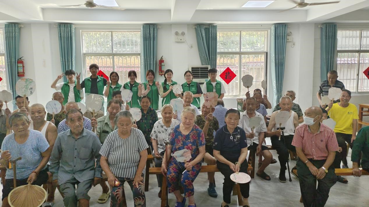 以非物质文化遗产为基础,“青春暖夕阳”团队为养老院带来了一系列别开生面的非遗文化体验活动。从体验传统的投壶游戏和象棋对弈到亲身制作漆扇,老人们乐在其中,尽显晚年风采。投壶游戏让老人们重温了儿时的乐趣,不仅锻炼了手眼协调能力,还增进了彼此间的友谊。象棋比赛更是吸引了众多爱好者的参与,棋盘上你来我往,难解难分,展现了老人们智慧与风采。在漆扇制作环节,老人们在团队成员的指导下,细心制作属于自己的漆扇。“当我看到漆扇在老人们手中呈现,色彩斑斓间,我觉得这不仅是一把扇子,更是连接过去和未来的桥梁。”生物科学专业2022级(4)班的严家玉表示,老人们在体验制作漆扇的过程中,不仅丰富了他们的精神文化生活,让非遗文化在养老院绽放出新的光彩,同时也有助于我们去弘扬和传承传统文化。