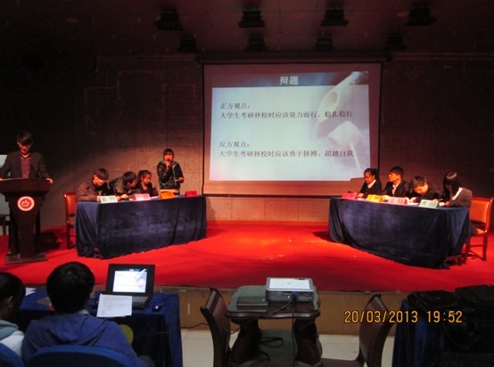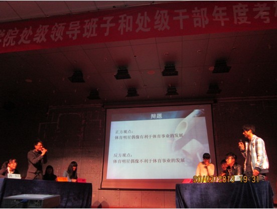 本次比赛分为两个场次,上半场辩题为“体育明星偶像化是否有利于体育事业的发展”,辩论双方展开激烈辩论,台上唇枪舌剑,现场的气氛逐渐升温。下半场比赛中,辩论双方以“老员工考研择校时应该量力而行,稳扎稳打”还是以“老员工考研择校应该勇于拼搏,超越自我”的观点进行辩论,双方通过立论,攻辩,自由辩论,结论等阶段,对各自所持观点,紧扣主题,进行阐述,将此次辩论赛气氛推向高潮。最后由双方辩手作总结陈词,并通过和现场观众进行互动,拉近了台上台下的距离。比赛结束,依据评委现场打分,12级生科1班、12级园林班、12级生科2班分获荣获一、二、三等奖,并评出优秀辩手若干名。赛后,团总支曹勇老师和丁元春老师分别结合辩手的表现作出了精彩的点评。