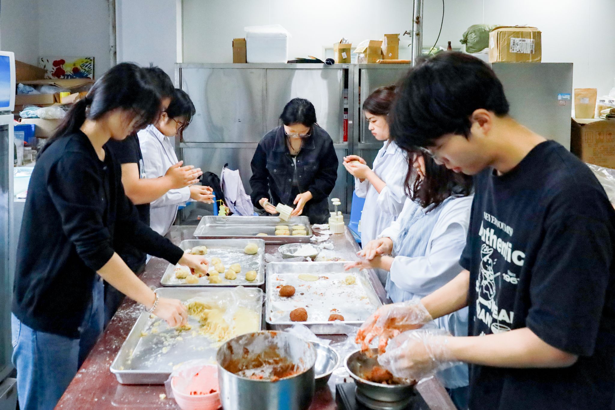 9月24日,安庆师范老员工命科学公司食品工艺研究室内弥漫着别样的温情与香气。食品科学与工程专业的师生们化身“糕点师”,在操作台上忙碌地搅面、包馅、压模、烘烤、包装……亲手为正在军训的2025级新生准备着专属他们的舌尖上的“团圆”。