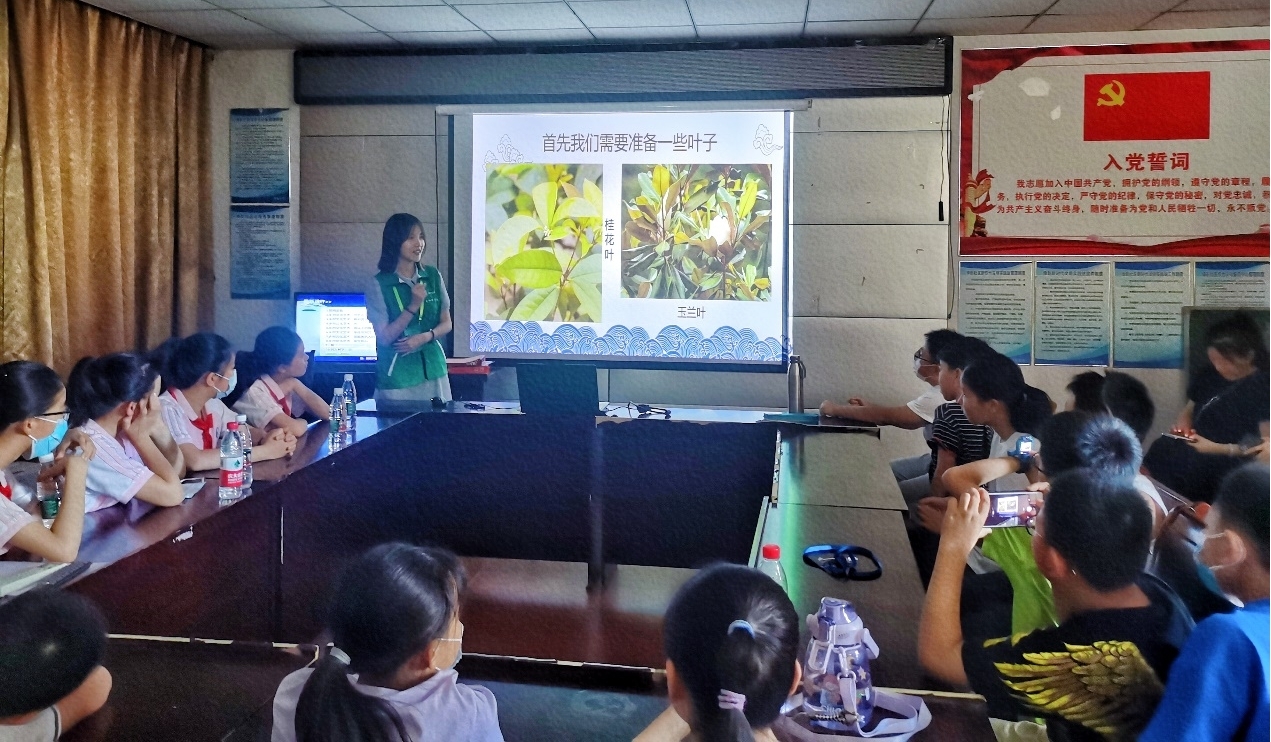 “大家平时见到的书签是什么样子的,有没有听过叶脉书签?下面我就给大家介绍一下极具生物特色的精美叶脉书签”,团队成员朱彤还对叶脉书签进行了科普。通过仔细介绍叶脉书签的制作过程,让小朋友们了解书签的制作,感受叶子不一样的价值。