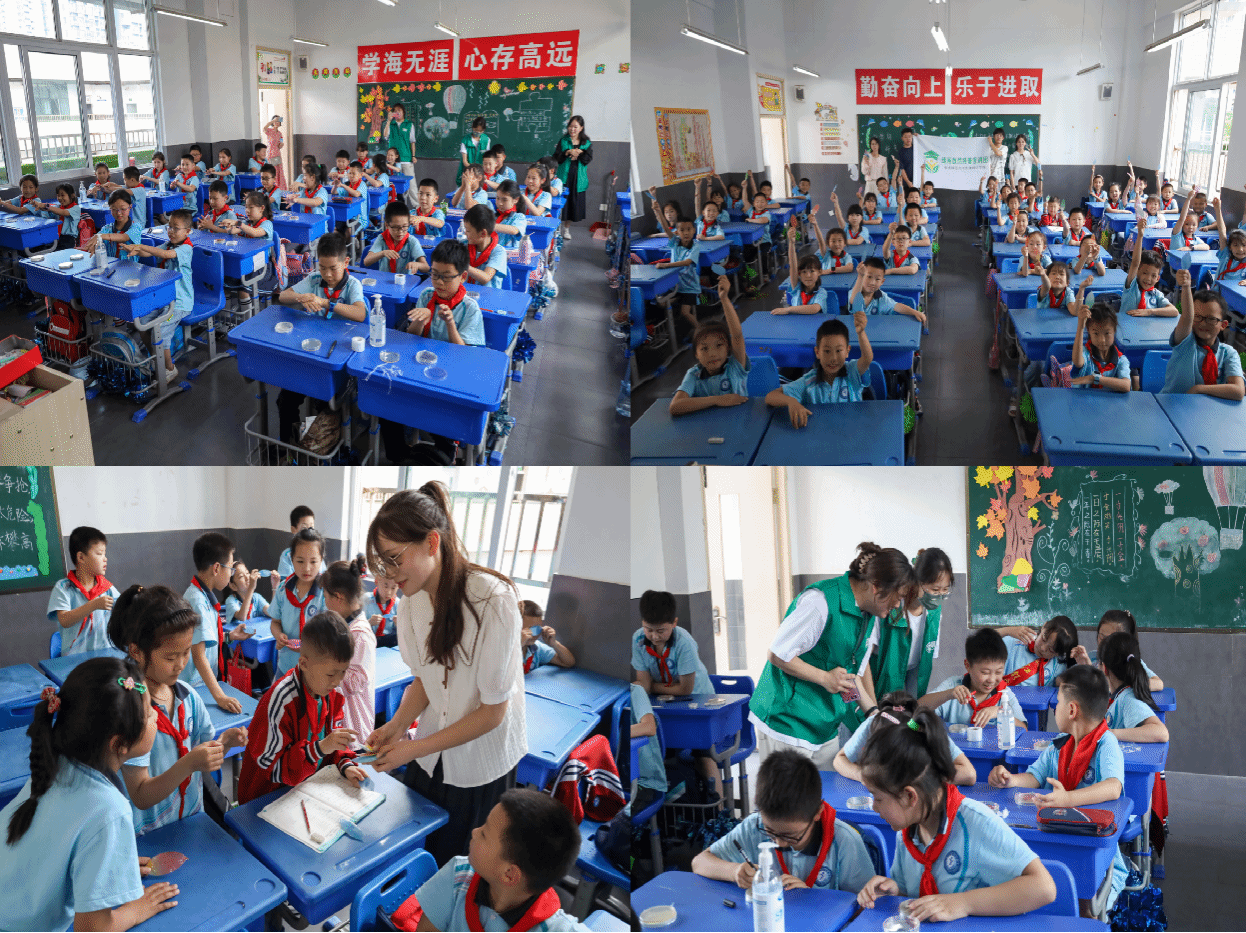 生物科学类专业2022(7)班的闫贝贝作为主讲人之一,则带领孩子们进入了微生物的奇妙世界。她将微生物知识融入日常生活事例,用浅显易懂的方式进行科普。闫贝贝还与孩子们定下了“三天之约”,让孩子们将洗过的手和未洗过的手摁压在不同培养基内,三天后观察不同。“想让孩子们知道自己手上存在大量细菌,从而养成勤洗手的好习惯。”