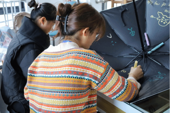 现场气氛活跃,参与员工纷纷发挥自己的创意,在伞上留下“温暖的印记”。选取样式、勾勒线条、填充颜色,生物科学类专业2023(2)班的王叶梅手边摆放着五颜六色的画笔,她正在专注地画着一个彩虹,“人生处处是彩虹,雨季过去便是万里晴空,愿大家的世界永远阳光明媚,色彩斑斓。”