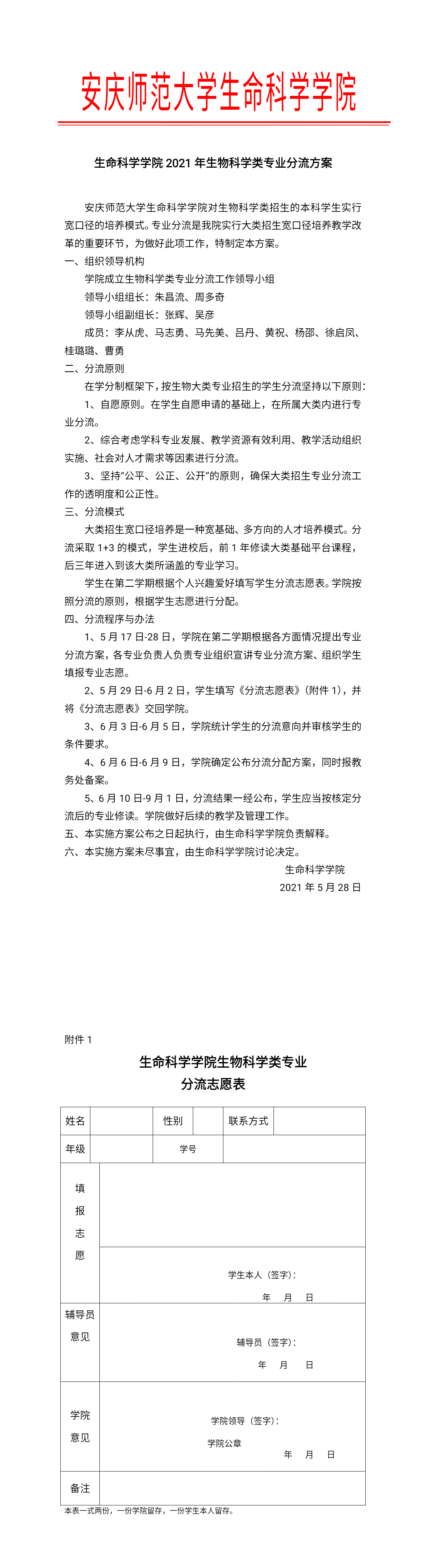 2021年生物科学类专业分流方案