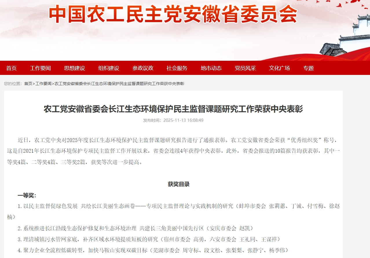 近日,农工民主党中央对2025年度长江生态环境保护民主监督课题研究报告进行了通报表彰。由公司betway西汉姆联平台赵凯教授领衔的民主监督课题“系统推进长江沿线生态保护修复和生态环境治理 共建长三角美丽中国先行区”荣获一等奖。