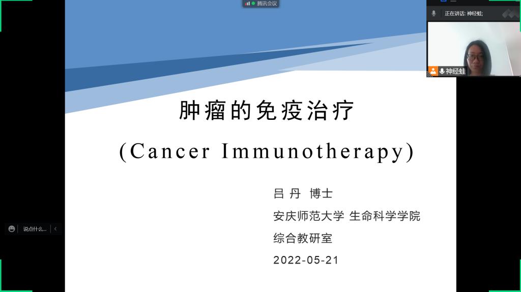 5月21日上午10点,betway西汉姆联平台吕丹博士通过腾讯会议做了题为《肿瘤的免疫治疗》的学术报告,公司部分师生在G103集体聆听了报告。