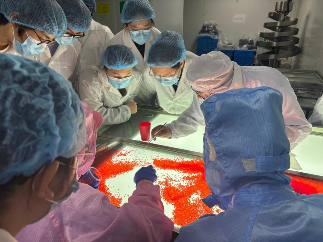 安徽一丸生物科技有限公司黄真媛经理对师生一行进行了热情接待,并详细介绍了企业的发展历程、核心业务(聚焦生物制剂研发及‘爆珠’等生物功能性产品生产)和技术优势。师生分多个小组,依次参观了公司的核心技术实验室。在企业技术人员的专业讲解与演示下,同学们系统了解了‘爆珠’产品的生产加工流程及其背后的生物技术原理,近距离感受了科技在生产实践中的应用,使同学们对“爆珠”产品的生产有了初步的认识。