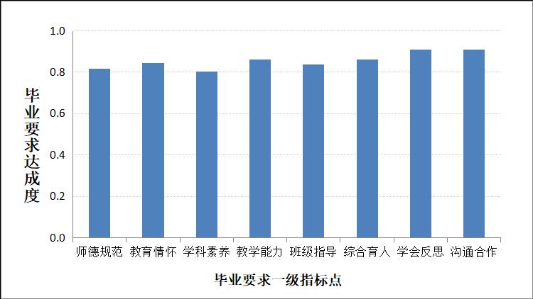 立德树人,德育为先,专业通过课堂教育、第二课堂教育等多种途径引导和促进师范生热爱中国共产党、热爱祖国、热爱社会主义,爱岗乐教,立德树人。“师德规范”毕业要求由《思想道德修养与法律基础》、《中国近现代史纲要》、《马克思主义基本原理》、《毛泽东思想和中国特色社会主义理论体系概论》、《教师职业道德专题教育》、《教育学基础》、《教育实习》、《形式与政策》等课程形成高支撑。基于高支撑课程的直接评价,师德规范二级指标1-1、1-2、1-3达成度分别为0.74、0.83、0.81,师德规范一级指标的达成度为0.74。第三方对本专业2020届从事教育工作的毕业生进行了师德规范的调查,毕业生认为师德规范符合度为100%,其中认为“很符合”占比84.52%,用人单位对公司生物科学专业毕业生思想品德与职业道德的满意度为100%,其中“很满意”占比73.33%,达成情况良好。