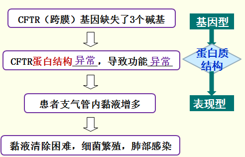大部分患者中,编码一个跨膜蛋白的基因缺失了3个碱基,导致跨膜蛋白的第508位缺少了一个苯丙氨酸,结果影响了跨膜蛋白的结构,使跨膜蛋白转运氯离子的功能异常,导致患者支气管中的黏液增多,管腔受阻,细菌在肺部大量繁殖,最终使肺功能严重受损。