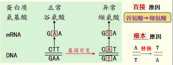 那么又是什么原因使正常的红细胞变成镰刀型红细胞?分子生物学研究表明是基因突变的结果。让我们来看看镰刀型细胞贫血症病因的图解。