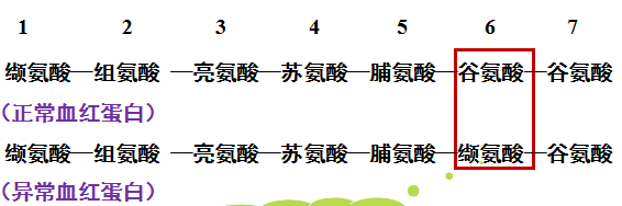 直接原因:正常血红蛋白第6位上的谷氨酸被缬氨酸取代。