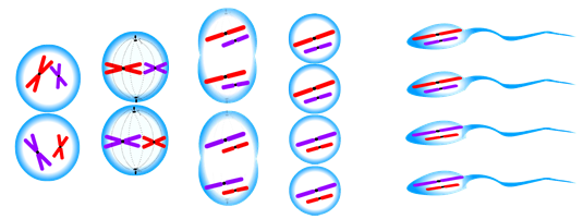 当雄性动物成熟后,睾丸里的一部分精原细胞就开始进行减数分裂,经过两次连续的分裂,形成精细胞,再经过精细胞的变形,最后形成了精子。