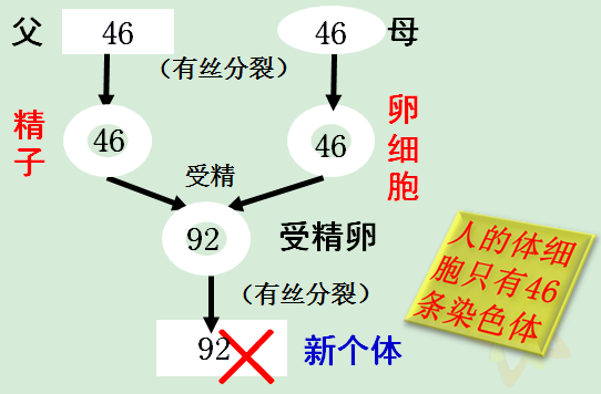 3.结果:受精卵的染色体数恢复到体细胞的数目,保证了物种染色体数目的稳定,其中有一半的染色体来自精子(父方),另一半来自卵细胞(母方)。