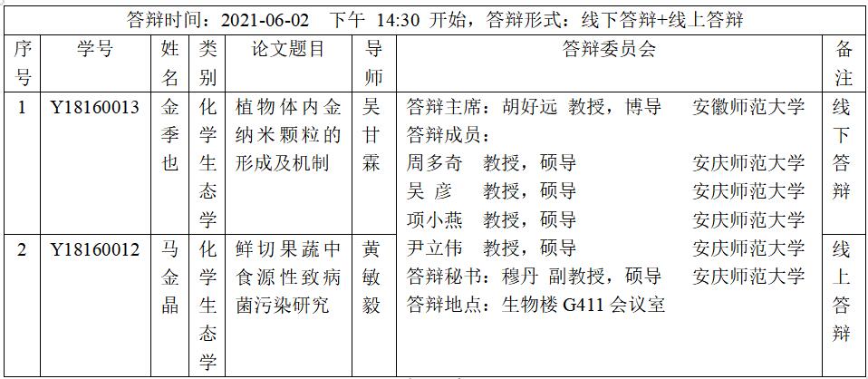 安庆师范老员工命科学公司2021届化员工态学硕士研究生学位论文答辩安排表