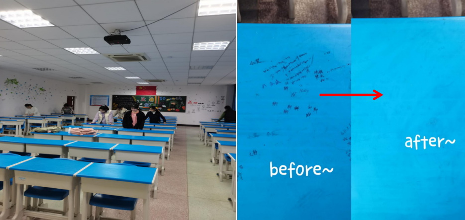 为将雷锋精神付诸于实际行动,生物科学类的十几位志愿者对betway西汉姆联平台教室的桌椅进行清理。将桌面上的涂鸦、修正带痕迹等处理干净,并将桌椅摆放整齐,公司教室焕然一新。同学们还给每个教室的讲台上放置了绿植,给教室添上了一抹绿色,让老师们在讲课时也能有舒适的环境。通过此次活动,让同学们领会到了劳动教育的深刻内涵和时代价值,也体会到奉献的快乐。