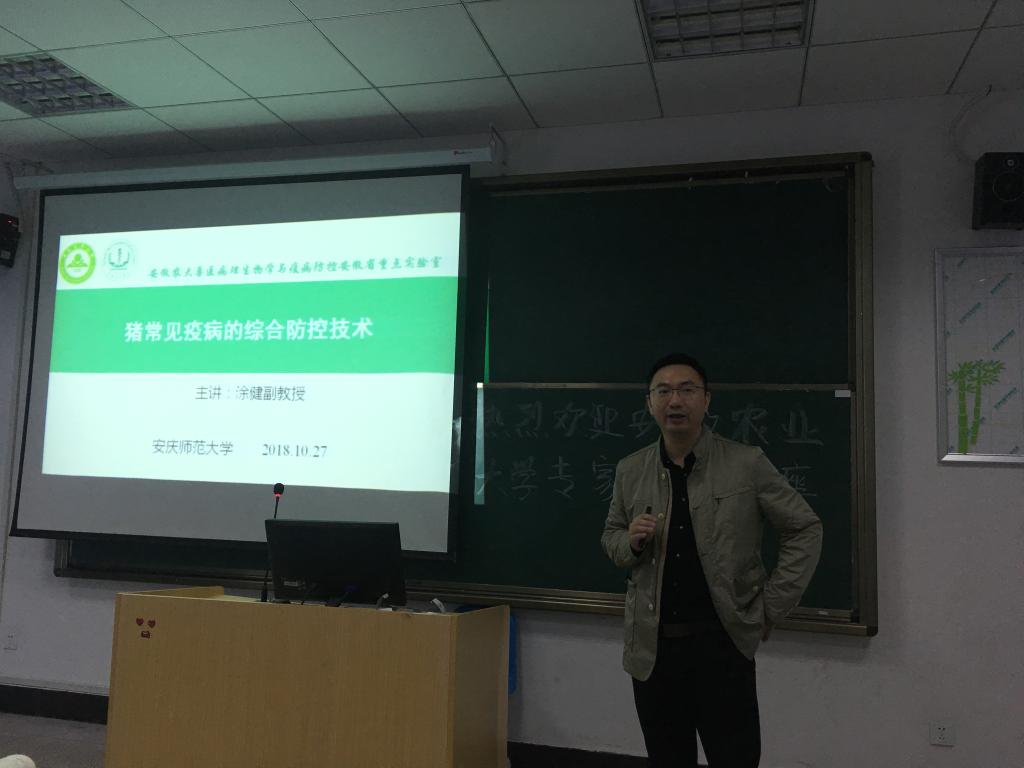 10月27日上午,安徽农业大学涂健副教授应betway西汉姆联平台邀请来公司作了题为《猪常见疫病防控技术》的学术讲座。讲座由betway西汉姆联平台经理周多奇主持,动植物检疫专业的师生聆听了报告。
